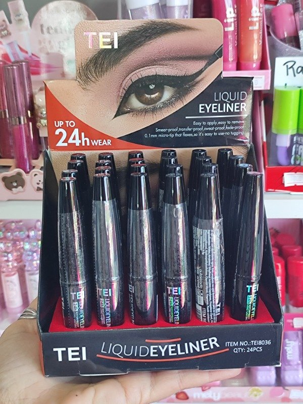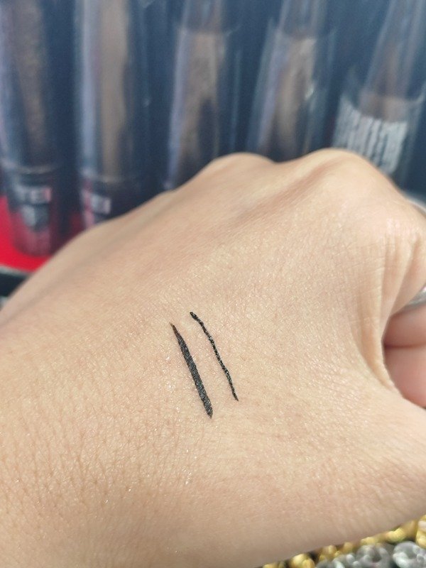 A prueba de agua. Larga duración, secado extra rápido. En el Swatch, La línea fina comparada con un delineador tradicional.
