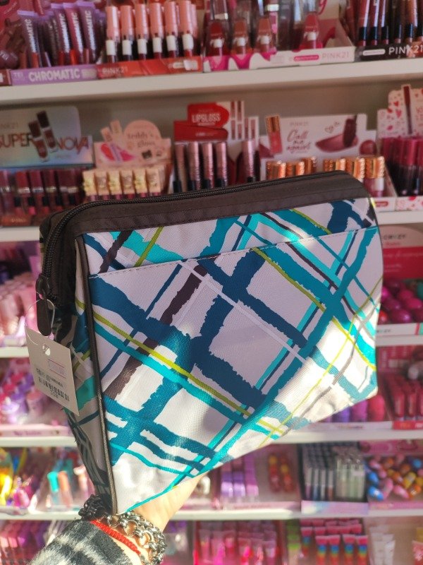 Forrado por dentro con acrílico transparente. Bolsillo interno con cierre y bolsillo externo con imán. Apertura boca de pez. Medidas aprox 24anchox22altox13fuelle.